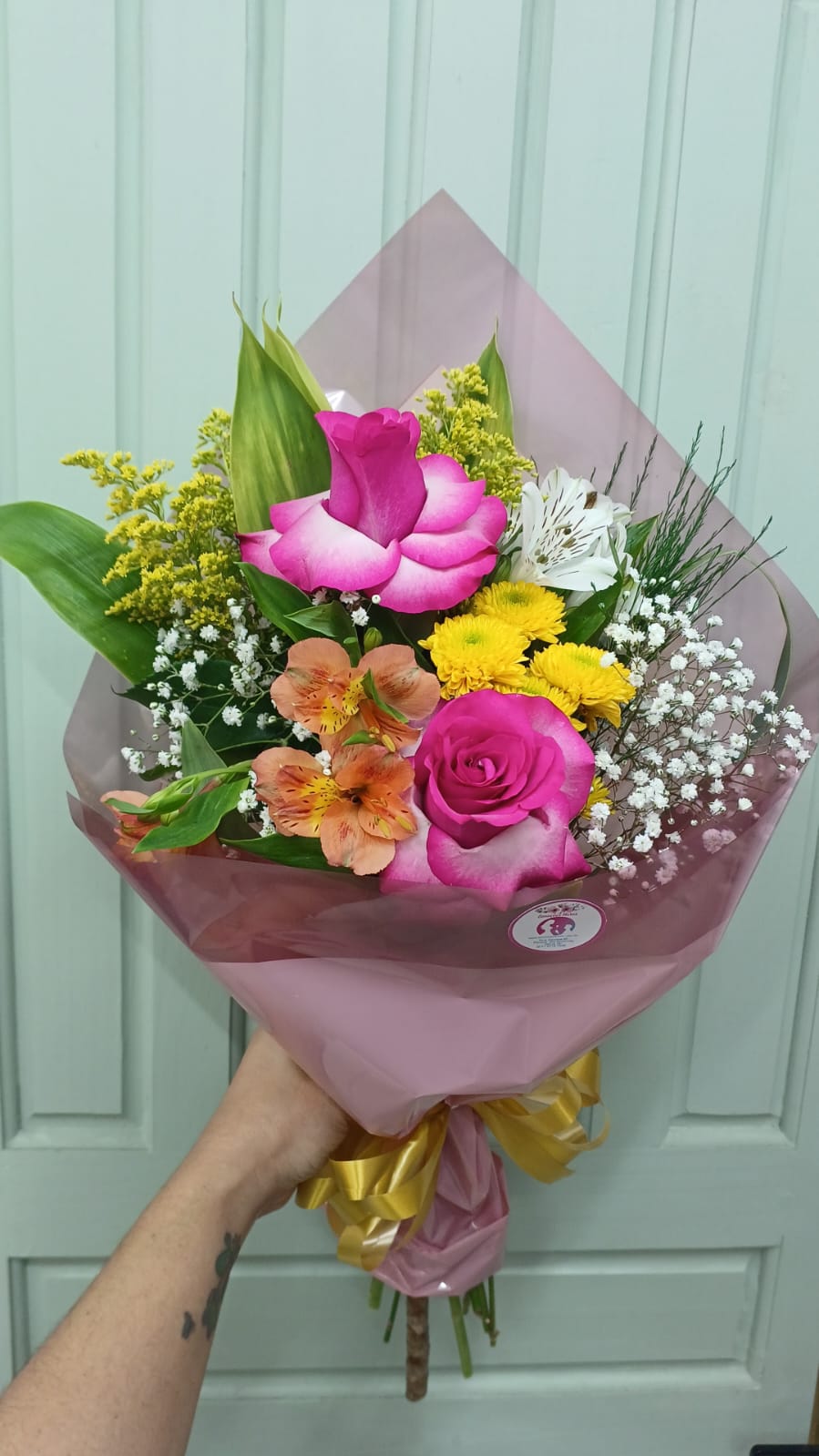 Com rosas pink naturais, flores do campo vibrantes e astromélias cheias de graça, envoltas em papel celofane personalizado e finalizadas com laço artesanal, este buquê transmite carinho, ternura e romantismo em cada pétala. 🌿