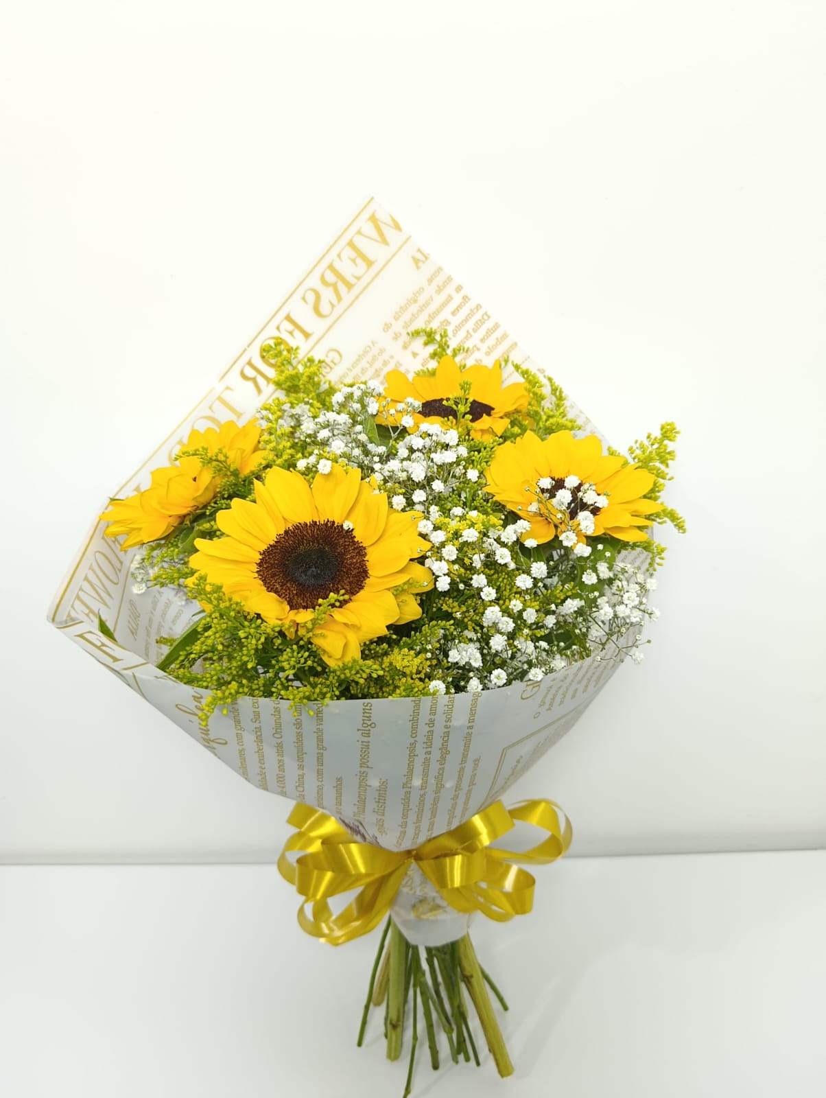 🌻✨ O Buquê de 4 (Quatro) Girassóis – Premium é perfeito para transmitir alegria, luz e boas energias! Com girassóis frescos e vibrantes, montados com folhagens selecionadas e acabamento em papel celofane personalizado com laço especial, este buquê encanta em qualquer ocasião. Ideal para presentear com brilho e significado.