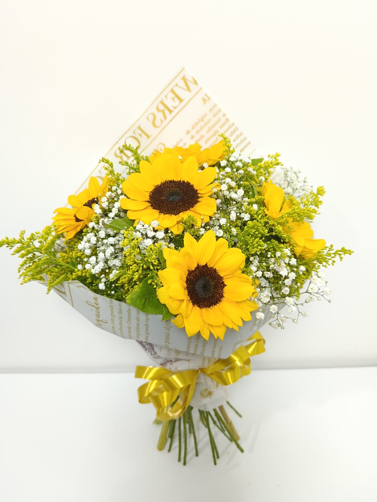 🌻✨ O Buquê de 5 (Cinco) Girassóis – Premium é pura energia, luz e celebração! Montado com girassóis frescos, folhagens selecionadas e acabamento em papel celofane personalizado com laço especial, ele transmite alegria imediata.
