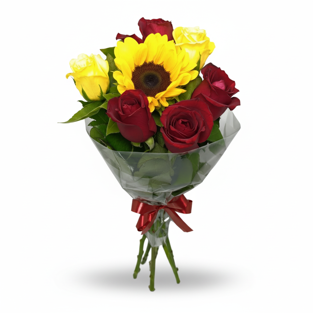?? Um buquê vibrante que combina 4 (quatro) rosas vermelhas, 2 (duas) rosas amarelas e 1 (um) girassol, simbolizando amor, alegria e boas energias. Montagem delicada com flores frescas, folhagens naturais, papel celofane personalizado e laço especial.