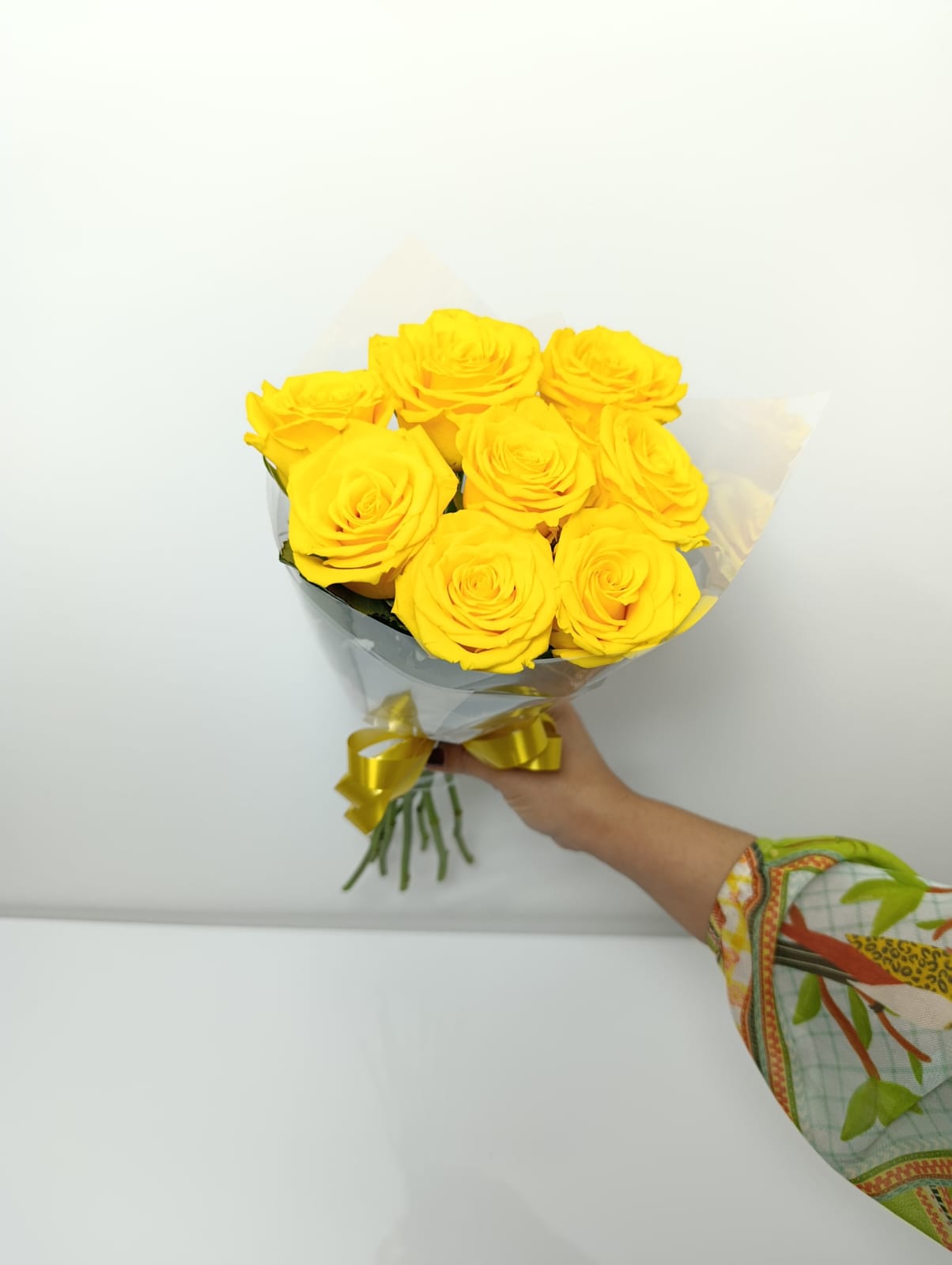 Cada rosa é cuidadosamente escolhida e envolta com papel celofane transparente, finalizada com um laço amarelo delicado, formando um arranjo leve, elegante e cheio de harmonia. 🎁🌿