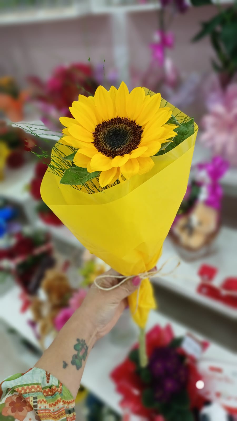 Com uma embalagem amarela elegante e delicada, o presente se torna ainda mais especial, destacando a beleza vibrante do girassol e encantando quem o recebe.